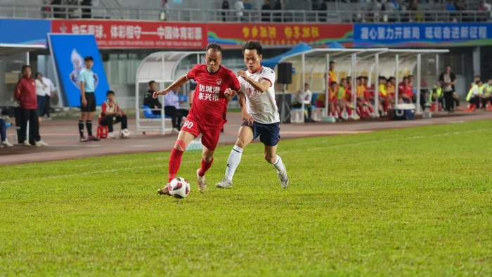 随着裁判哨声响起,比赛激情开启。球员们伺机传球、冲刺、拼抢、射门,两队攻守之势几度转换。上半场第17分钟,东兴市队球员邓傅仁高速插上,面对门将抽射破门,首开纪录,东兴市队以1∶0领先;第36分钟,东兴市队球员苏浩昇在边路突破后下底传中,足球击中龙州县队防守队员后折射入网,将比分改写为2∶0。下半场第11分钟,邓傅仁凭借一粒点球一击命中,帮助球队锁定胜局。